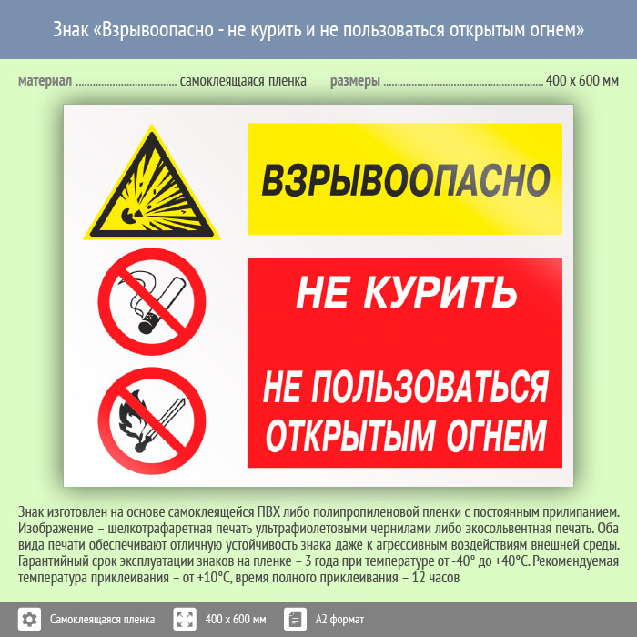 Знак «Взрывоопасно - не курить и не пользоваться открытым огнем», КЗ-09 (пленка, 600х400 мм) в Бердске купить