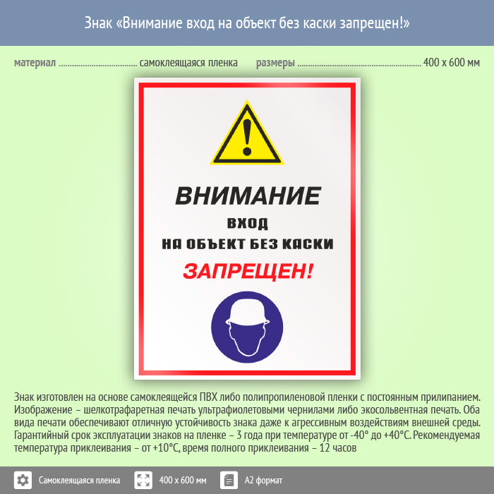 Знак «Внимание вход на объект без каски запрещен!», КЗ-13 (пленка, 400х600 мм) в Бердске купить