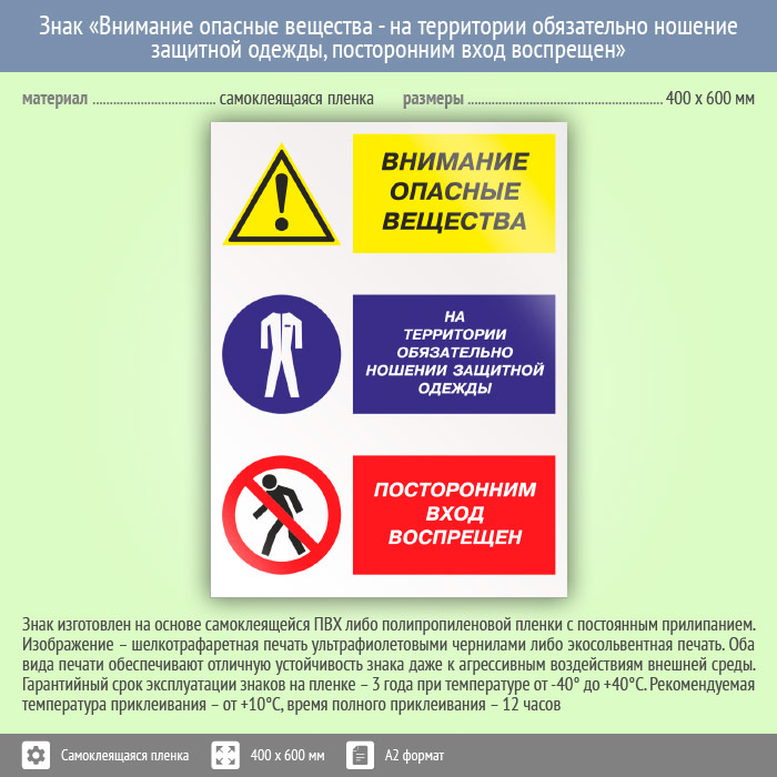Знак «Внимание опасные вещества - на территории обязательно ношение защитной одежды, посторонним вход воспрещен», КЗ-15 (пленка, 400х600 мм) в Бердске купить