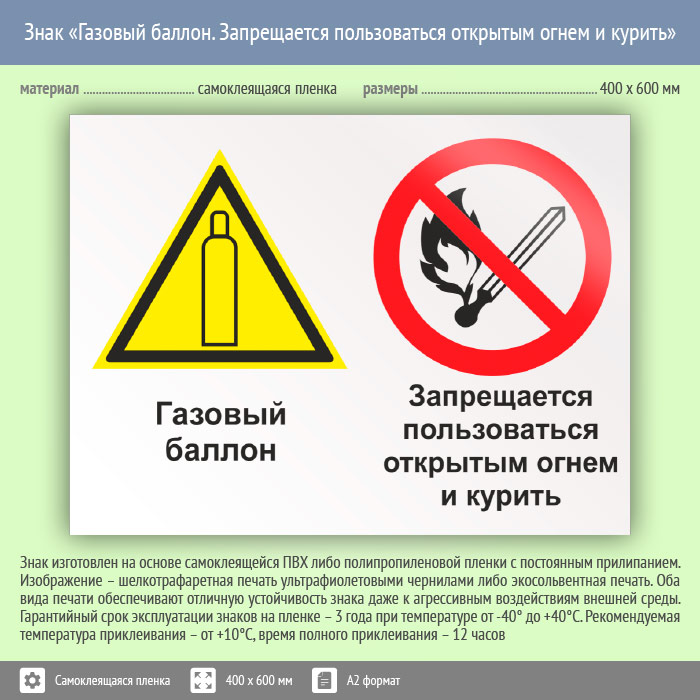 Знак «Газовый баллон. Запрещается пользоваться открытым огнем и курить», КЗ-19 (пленка, 600х400 мм) в Бердске купить