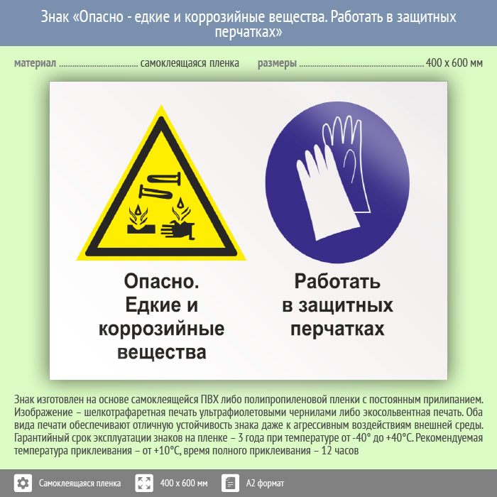Знак «Опасно - едкие и коррозийные вещества. Работать в защитных перчатках», КЗ-36 (пленка, 600х400 мм) в Бердске купить