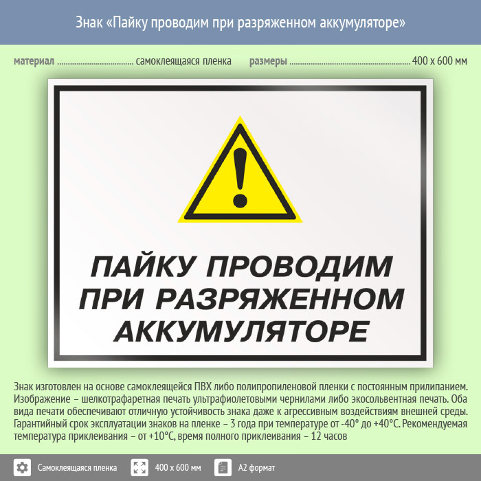 Знак «Пайку проводим при разряженном аккумуляторе», КЗ-62 (пленка, 600х400 мм) в Бердске купить