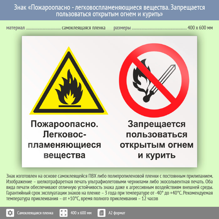 Знак «Пожароопасно - легковоспламеняющиеся вещества. Запрещается пользоваться открытым огнем и курить», КЗ-70 (пленка, 600х400 мм) в Бердске купить