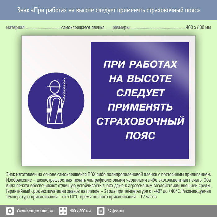 Знак «При работах на высоте следует применять страховочный пояс», КЗ-75 (пленка, 600х400 мм) в Бердске купить