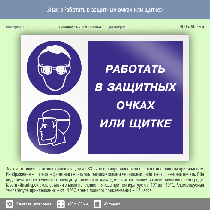Знак «Работать в защитных очках или щитке», КЗ-80 (пленка, 600х400 мм) в Бердске купить