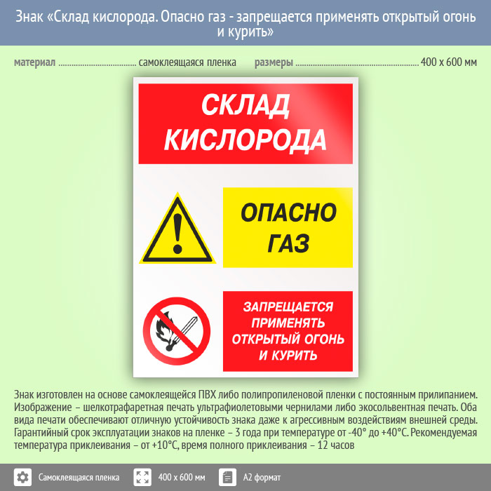 Знак «Склад кислорода. Опасно газ - запрещается применять открытый огонь и курить», КЗ-85 (пленка, 400х600 мм) в Бердске купить