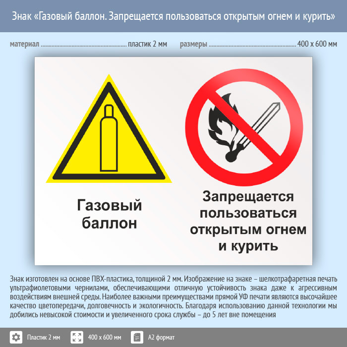 Знак «Газовый баллон. Запрещается пользоваться открытым огнем и курить», КЗ-19 (пластик, 600х400 мм) в Бердске купить