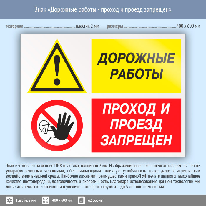 Знак «Дорожные работы - проход и проезд запрещен», КЗ-20 (пластик, 600х400 мм) в Бердске купить