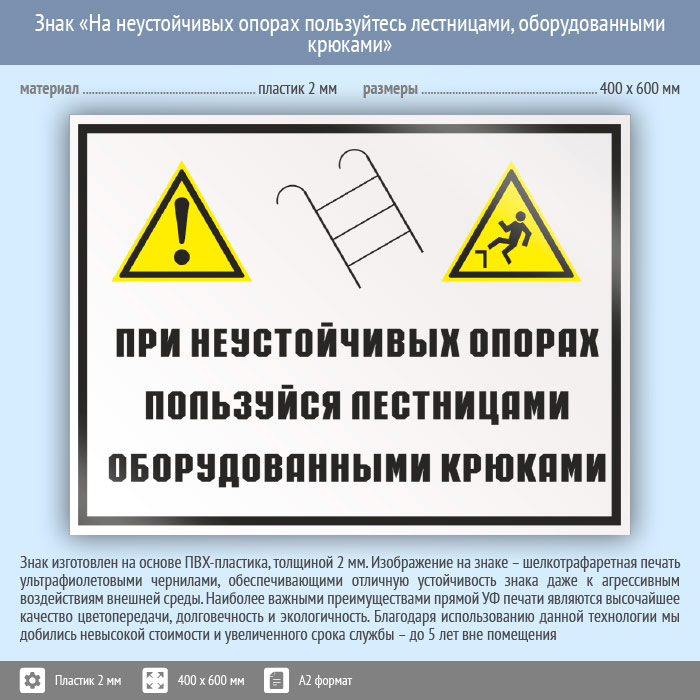 Знак «На неустойчивых опорах пользуйтесь лестницами, оборудованными крюками», КЗ-22 (пластик, 600х400 мм) в Бердске купить