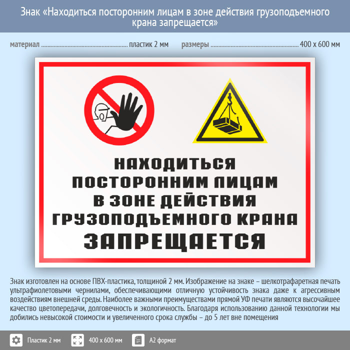 Знак «Находиться посторонним лицам в зоне действия грузоподъемного крана запрещается», КЗ-23 (пластик, 600х400 мм) в Бердске купить