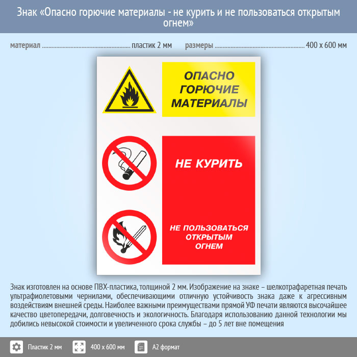 Знак «Опасно горючие материалы - не курить и не пользоваться открытым огнем», КЗ-45 (пластик, 400х600 мм) в Бердске купить