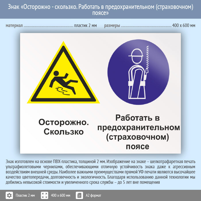Знак «Осторожно - скользко. Работать в предохранительном (страховочном) поясе», КЗ-58 (пластик, 600х400 мм) в Бердске купить