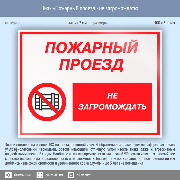 Знак «Пожарный проезд - не загромождать», КЗ-67 (пластик, 600х400 мм) в Бердске купить
