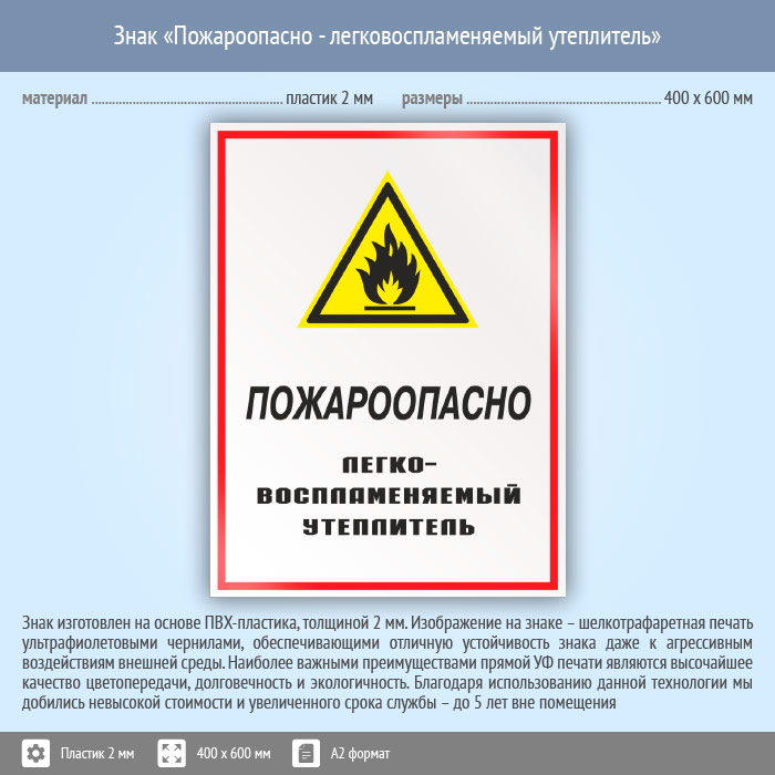 Знак «Пожароопасно - легковоспламеняемый утеплитель», КЗ-68 (пластик, 400х600 мм) в Бердске купить
