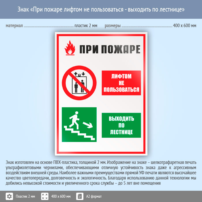 Знак «При пожаре лифтом не пользоваться - выходить по лестнице», КЗ-73 (пластик, 400х600 мм) в Бердске купить