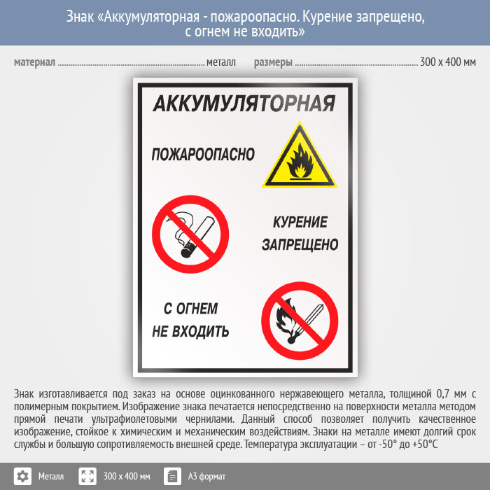 Знак «Аккумуляторная - пожароопасно. Курение запрещено, с огнем не входить», КЗ-01 (металл, 300х400 мм) в Бердске купить