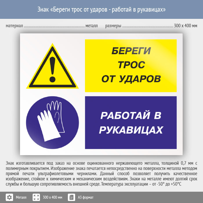 Знак «Береги трос от ударов - работай в рукавицах», КЗ-03 (металл, 400х300 мм) в Бердске купить