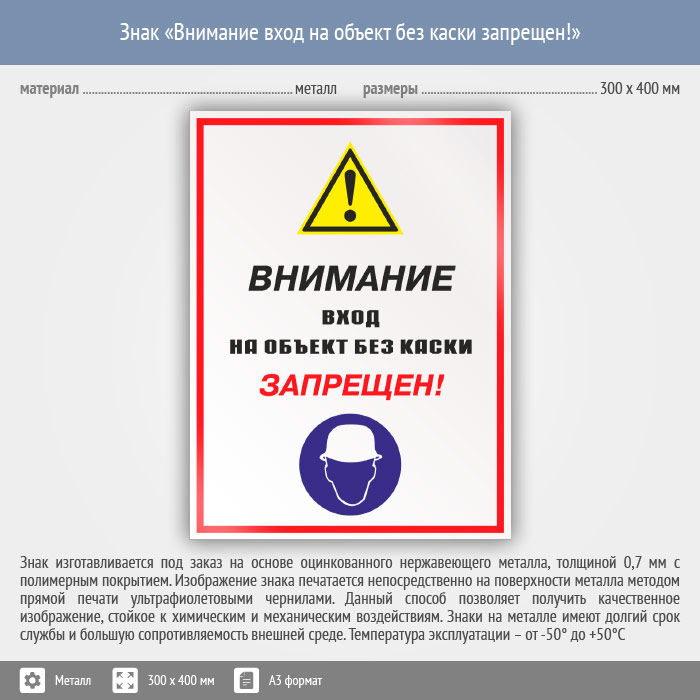 Знак «Внимание вход на объект без каски запрещен!», КЗ-13 (металл, 300х400 мм) в Бердске купить