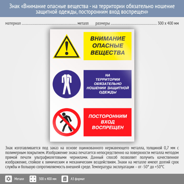 Знак «Внимание опасные вещества - на территории обязательно ношение защитной одежды, посторонним вход воспрещен», КЗ-15 (металл, 300х400 мм) в Бердске купить