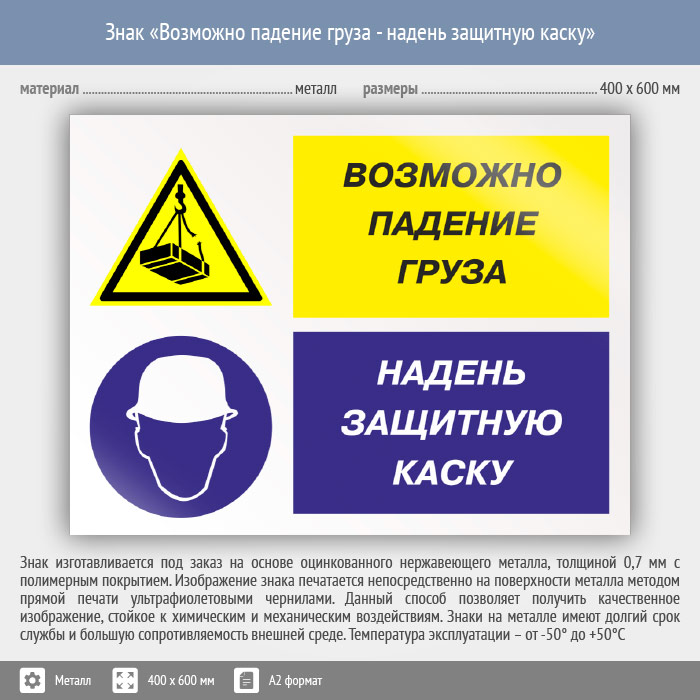 Знак «Возможно падение груза - надень защитную каску», КЗ-17 (металл, 600х400 мм) в Бердске купить