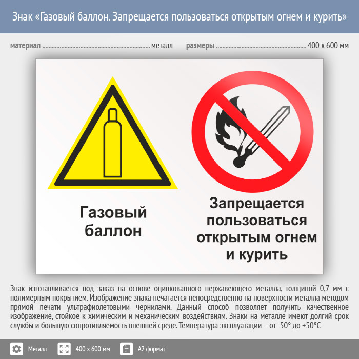 Знак «Газовый баллон. Запрещается пользоваться открытым огнем и курить», КЗ-19 (металл, 600х400 мм) в Бердске купить