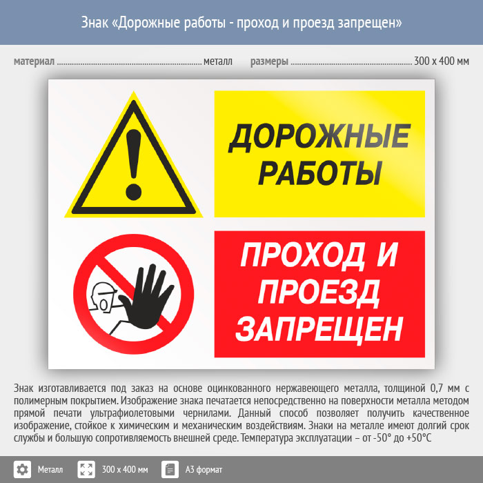 Знак «Дорожные работы - проход и проезд запрещен», КЗ-20 (металл, 400х300 мм) в Бердске купить
