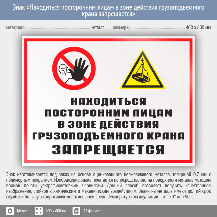 Знак «Находиться посторонним лицам в зоне действия грузоподъемного крана запрещается», КЗ-23 (металл, 600х400 мм) в Бердске купить