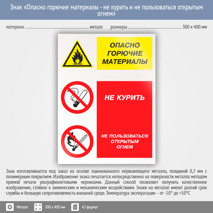 Знак «Опасно горючие материалы - не курить и не пользоваться открытым огнем», КЗ-45 (металл, 300х400 мм) в Бердске купить