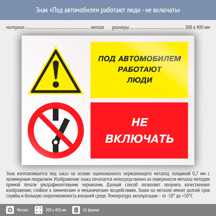 Знак «Под автомобилем работают люди - не включать», КЗ-65 (металл, 400х300 мм) в Бердске купить