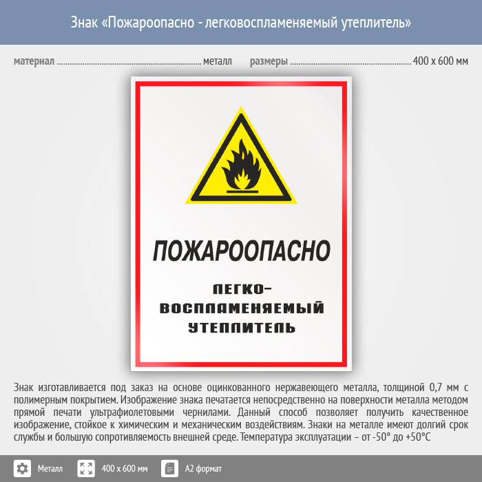 Знак «Пожароопасно - легковоспламеняемый утеплитель», КЗ-68 (металл, 400х600 мм) в Бердске купить