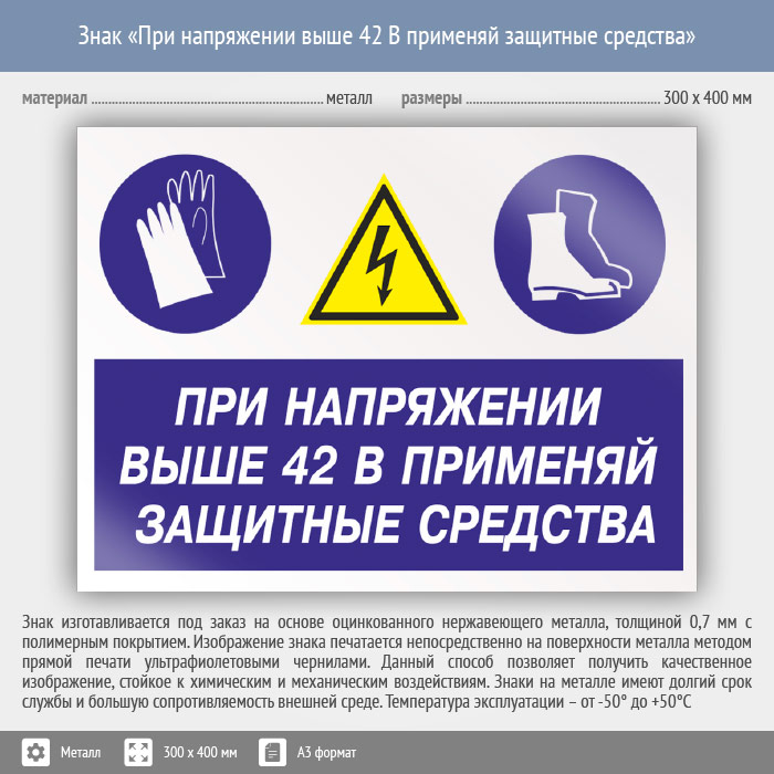 Знак «При напряжении выше 42 В применяй защитные средства», КЗ-72 (металл, 400х300 мм) в Бердске купить