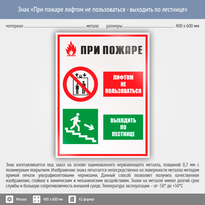 Знак «При пожаре лифтом не пользоваться - выходить по лестнице», КЗ-73 (металл, 400х600 мм) в Бердске купить