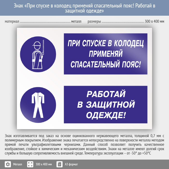 Знак «При спуске в колодец применяй спасательный пояс! Работай в защитной одежде», КЗ-76 (металл, 400х300 мм) в Бердске купить