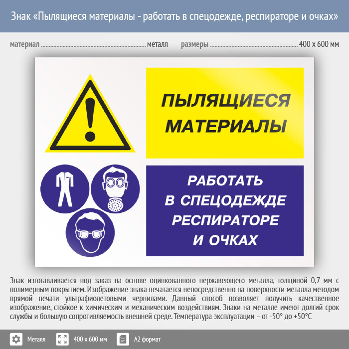 Знак «Пылящиеся материалы - работать в спецодежде, респираторе и очках», КЗ-79 (металл, 600х400 мм) в Бердске купить