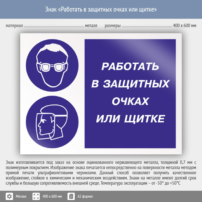 Знак «Работать в защитных очках или щитке», КЗ-80 (металл, 600х400 мм) в Бердске купить