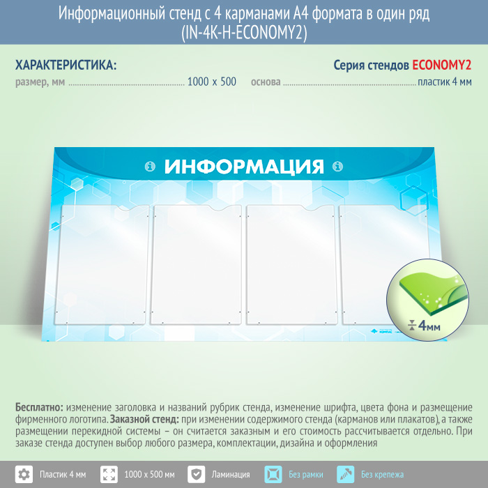 Информационный стенд с 4 карманами А4 формата в один ряд (IN-4K-H-ECONOMY2) в Бердске купить