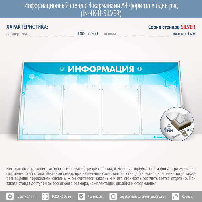Информационный стенд с 4 карманами А4 формата в один ряд (IN-4K-H-SILVER) в Бердске купить