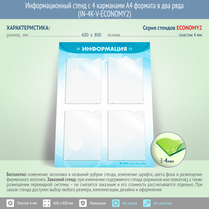 Информационный стенд с 4 карманами А4 формата в два ряда (IN-4K-V-ECONOMY2) в Бердске купить