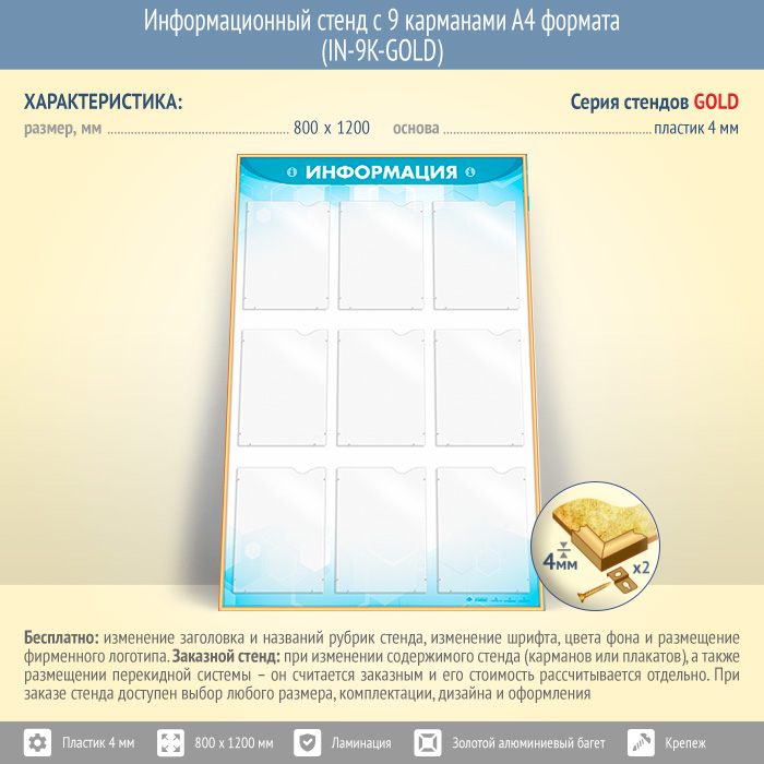 Информационный стенд с 9 карманами А4 формата (IN-9K-GOLD) в Бердске купить