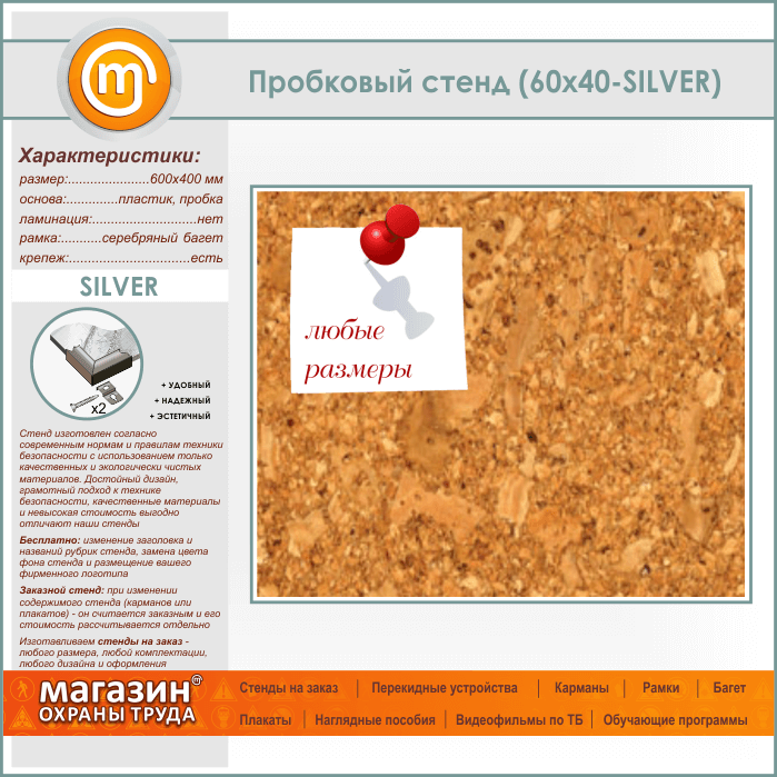 Пробковая доска, 60х40 см (IN-05-SILVER) в Бердске купить