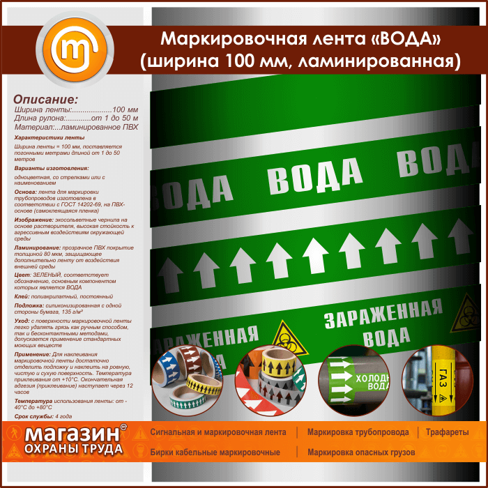 Маркировочная лента «ВОДА» (ширина 100 мм, самоклеящаяся плёнка с ламинированием) в Бердске купить