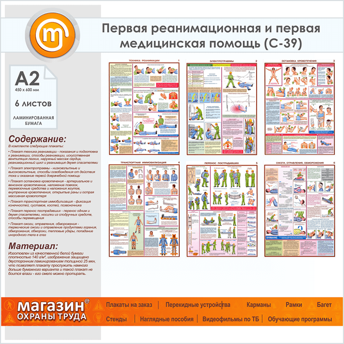 Плакат «Оказание первой помощи пострадавшим» (С-39, ламинированная бумага, А2, 6 листов) в Бердске купить