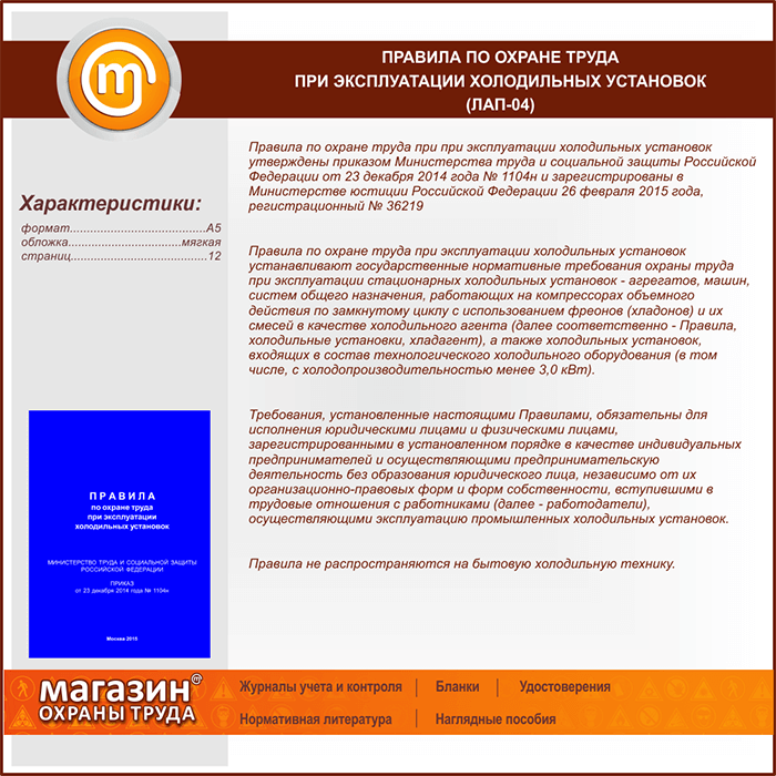 Правила по охране труда при эксплуатации холодильных установок (Приказ Минтруда РФ от 23.12.2014 №1104н) (ЛАП-04) в Бердске купить
