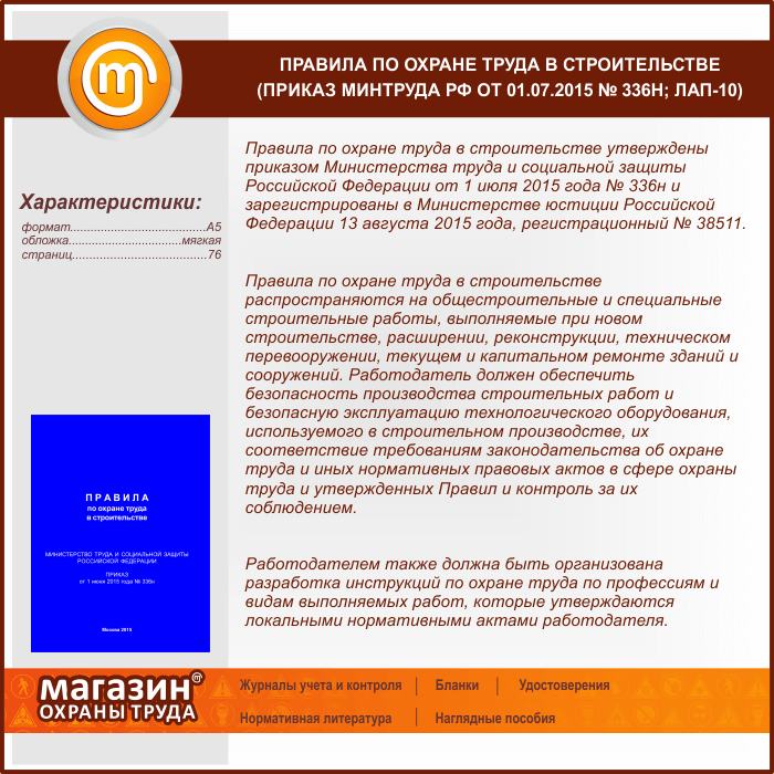 Правила по охране труда в строительстве (Приказ Минтруда РФ от 01.07.2015 № 336н) (ЛАП-10) в Бердске купить