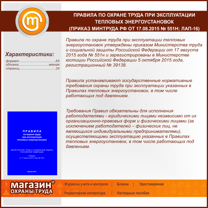 Правила по охране труда при эксплуатации тепловых энергоустановок (Приказ Минтруда РФ от 17.08.2015 № 551н) (ЛАП-16) в Бердске купить