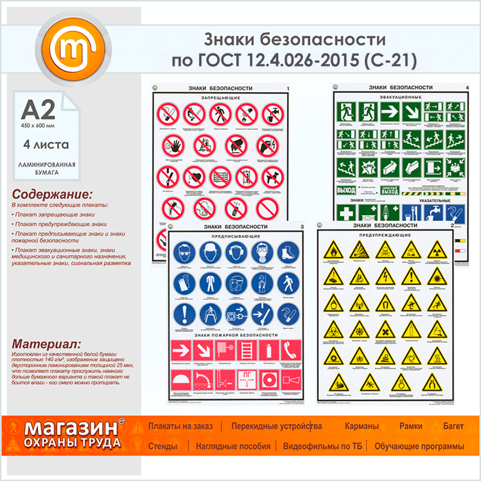 Плакаты «Знаки безопасности по ГОСТ 12.4.026-2015» (С-21, ламинированная бумага, А2, 4 листа) в Бердске купить