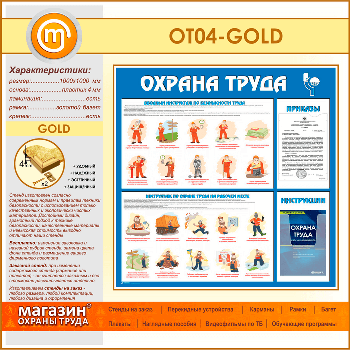 Стенд «Охрана труда» с плоским и объемным карманами (OT-04-GOLD) в Бердске купить