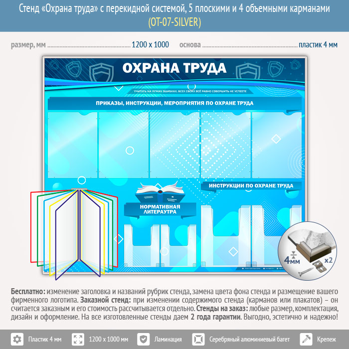 Стенд «Охрана труда» с перекидной системой, 5 плоскими и 4 объемными карманами (OT-07-SILVER) в Бердске купить