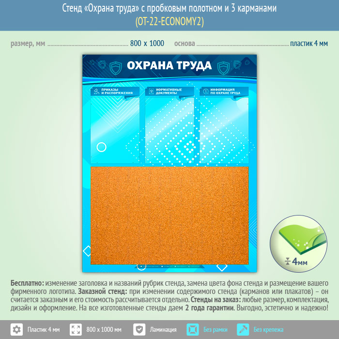 Стенд «Охрана труда» с пробковым полотном и 3 карманами (OT-22-ECONOMY2) в Бердске купить