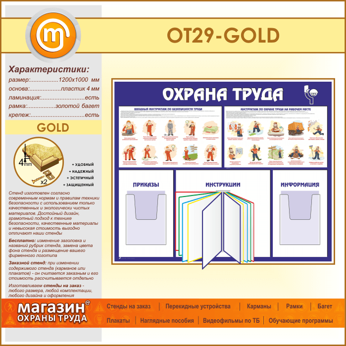 Стенд «Охрана труда» с перекидной системой и 2 объемными карманами (OT-29-GOLD) в Бердске купить